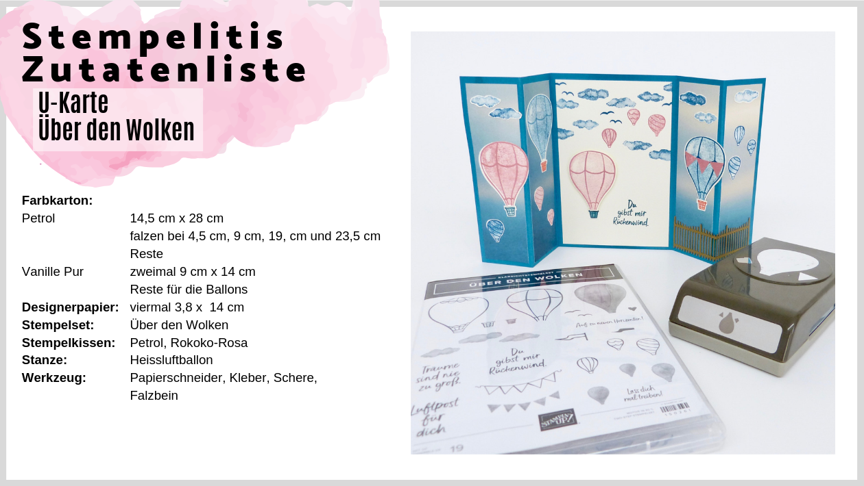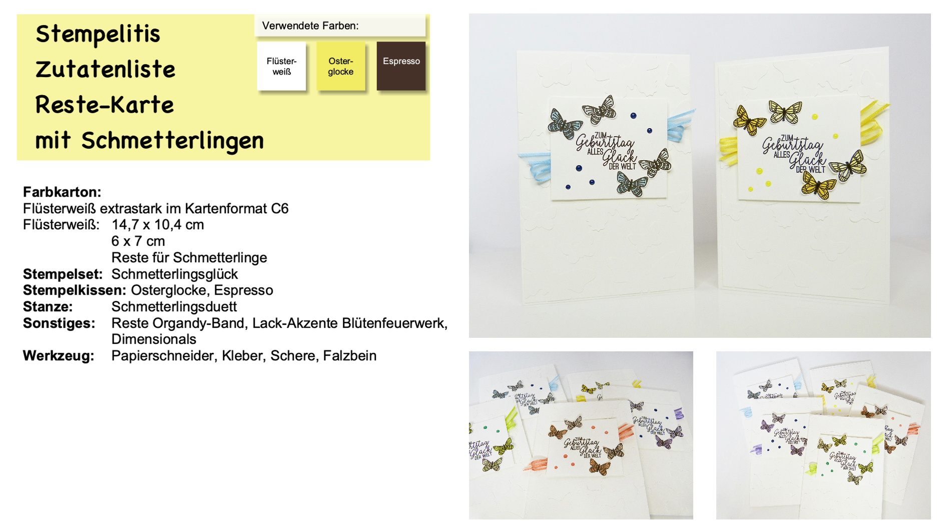 Auf dieser Seite findest du viele Anleitungen für Karten in unterschiedlichen Techniken. Eine genaue Zutatenliste hilft dir, das nötige Material vorzubereiten. Farben und Muster kannst du an deine Wünsche und vorhandenes Papier und Stempel anpassen. Du kannst auch die aufgelisteten Produkte bei mir kaufen, sofern sie noch im Sortiment von Stampin’ Up! erhältlich sind.