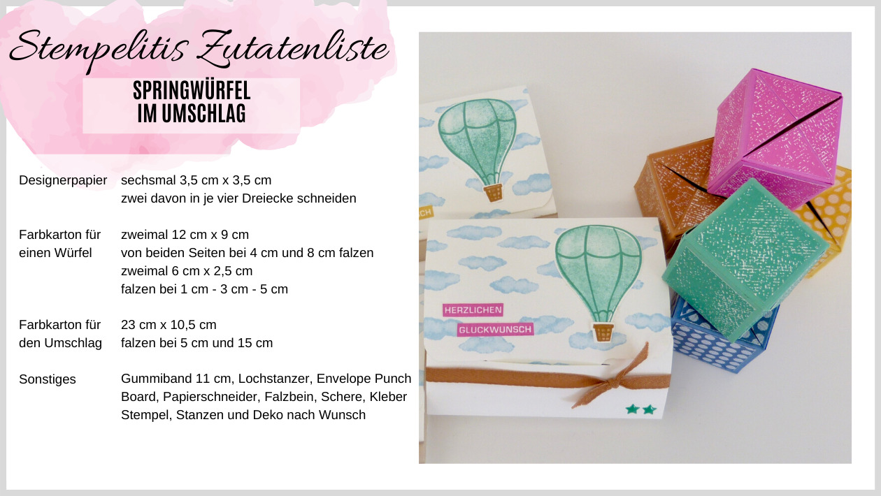 Eine ganz tolle Kartenform mit 3D Effekt. Achtung, kleiner Fehler in der Zutatenliste: Wenn du die Karte auch außen dekorieren willst, brauchst du zwei zusätzliche Stücke Farbkarton in Jade 10 cm x 10 cm und Designerpapier 9,5 cm x 9,5 cm.