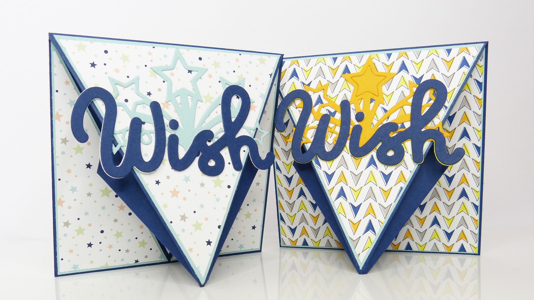 Den großen Wish Schriftzug findest du bei den Framelits Im Rampenlicht aus der Produktreihe Broadway. Er ist jeweils einmal in Marineblau ausgestanzt und mit Flüsterweiß beziehungsweiße Ananas hinterlegt. Zum einen, um das Stanzelement stabiler zu machen (es ist ja nicht komplett aufgeklebt), zum anderen, um einen leichten Schatteneffekt zu erhalten. Dafür sollten die beiden Worte auch nicht perfekt übereinander kleben.