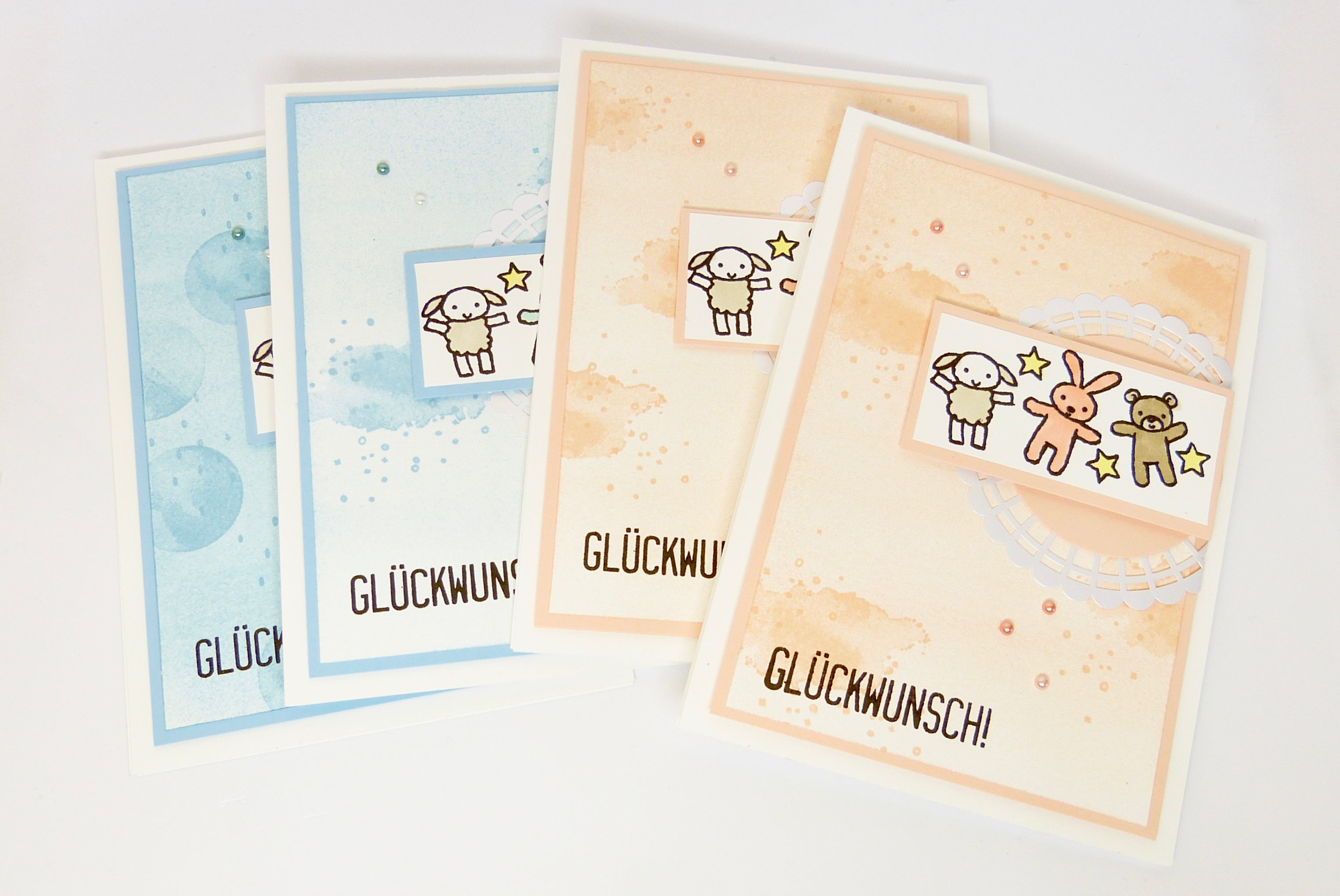 Gestempelt habe ich die Kuscheltiere aus dem Stempelset Moon Baby, koloriert mit Stampin Blends, und der Glückwunsch ist aus dem Kartenset Grüße wie gemalt. Die Stempel im Hintergrund sind allesamt aus dem SAB Set Vielseitige Grüße.