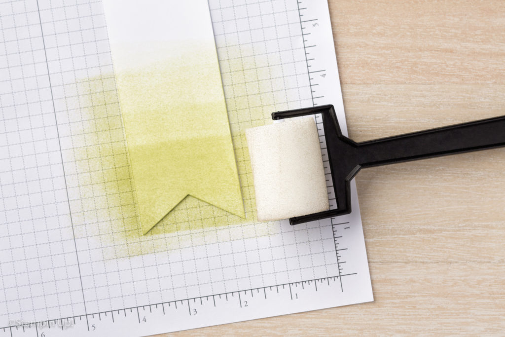 Die Farbe nimmst du direkt aus einem Stempelkissen auf, indem du mit der Schwammwalze ganz oft über das Stempelkissen drüberrollst.