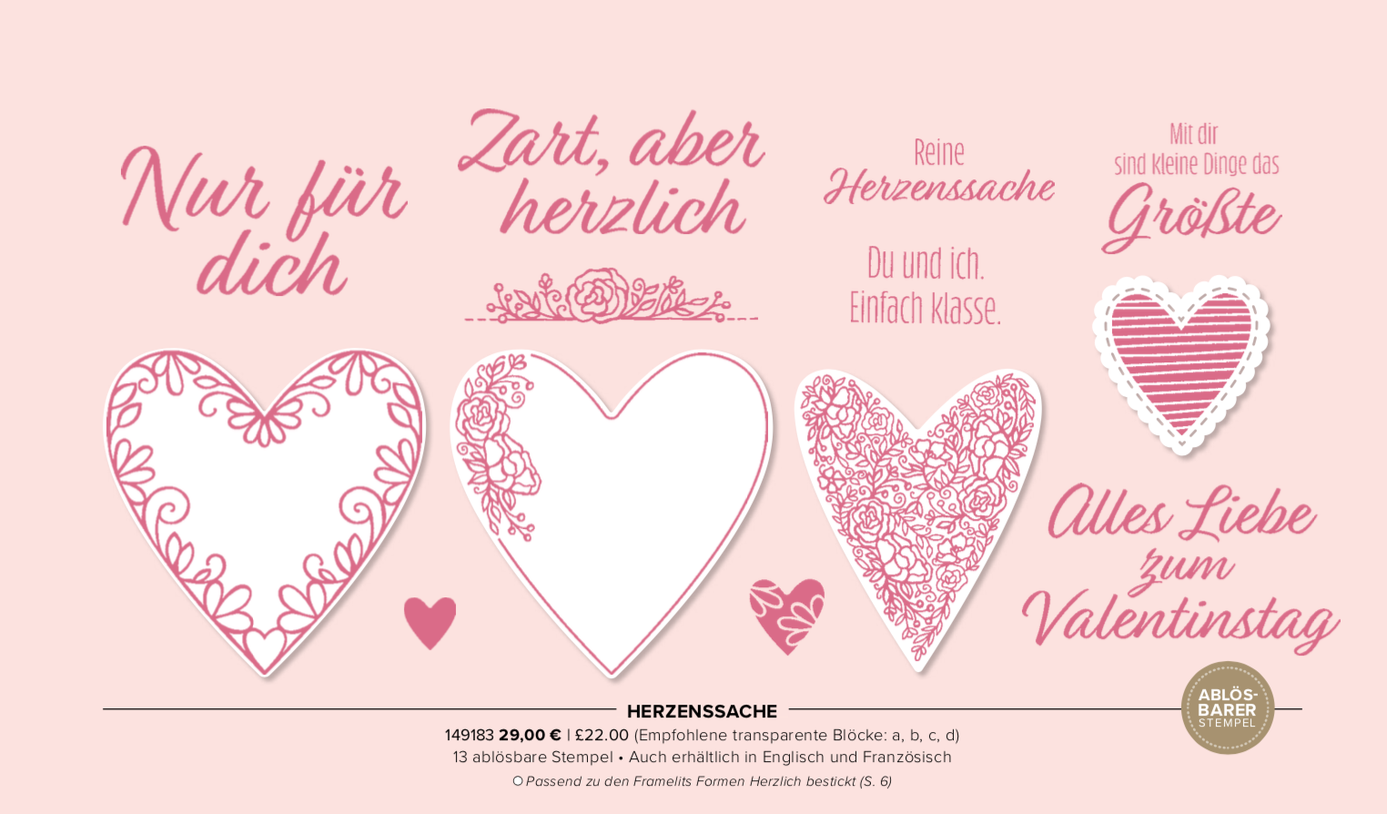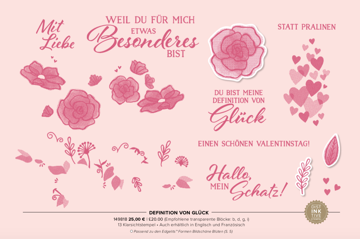 Das Stempelset Definition von Glück gehört zur Produktreihe In Liebe. Eigentlich ist es sogar ein Doppelpack mit jeweils einem Stempelset und Stanzformen. Denn auf der nächsten Seite im Katalog findest du noch das Produktpaket Herzenssache. Beide Sets lassen sich perfekt miteinander kombinieren und zu beiden passen das Designerpapier, das Geschenkband und die Epoxid-Herzchen.