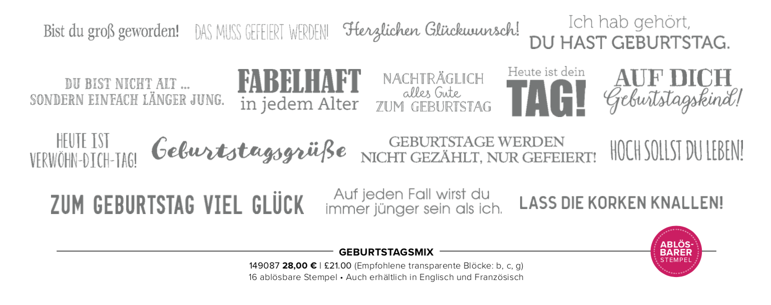 Den Stempel “Verwöhn Dich Tag!” findest du im Frühjahrskatalog auf Seite 16. Das Stempelset Geburtstagsmix hat insgesamt 16 verschiedene Textstempel, die speziell auf Geburtstagsglückwünsche zugeschnitten sind, aber eben nicht nur.