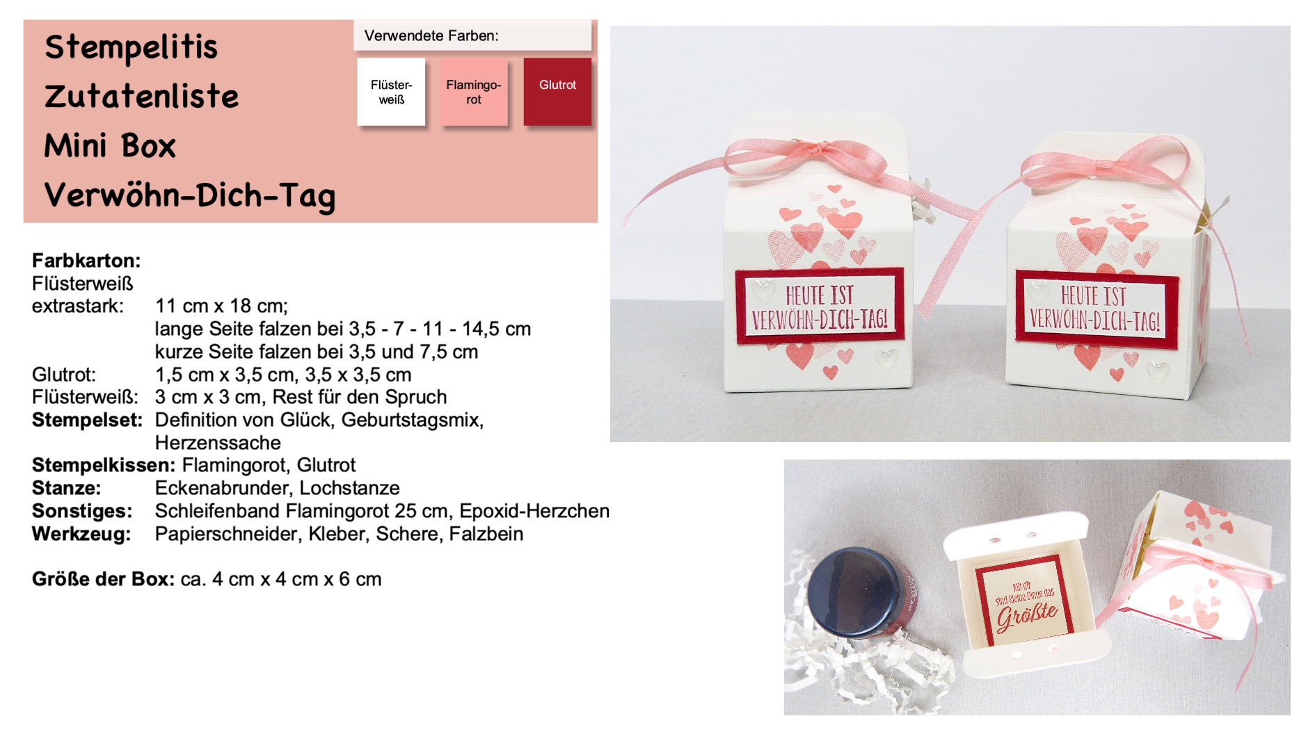 Heute ist Verwöhn Dich Tag! Mit dieser kleinen Box kannst du ein bisschen Wellness verschenken. Überlege mal, wer in deinem Freundeskreis sich eine Auszeit verdient hat. Und dann leg los und bastle meine Verpackung nach. Ich habe hier das Tutorial für dich.