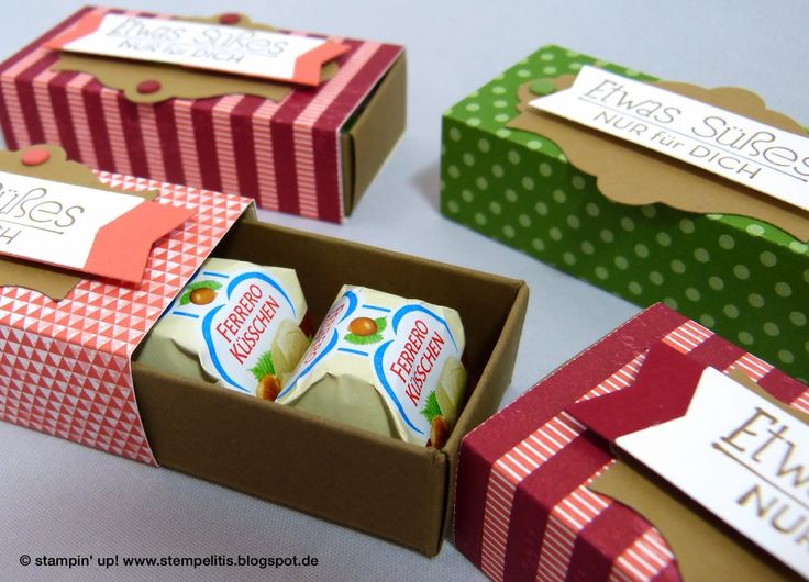 Eine kleine Box für Küsschen (drei Stück passen hinein). Mit ein wenig Farbkarton und Designerpapier ist die Box schnell gebastelt. Die Boxen auf dem Bild habe ich vor langer Zeit gemacht, aber sie sind immer noch heiß begehrt.