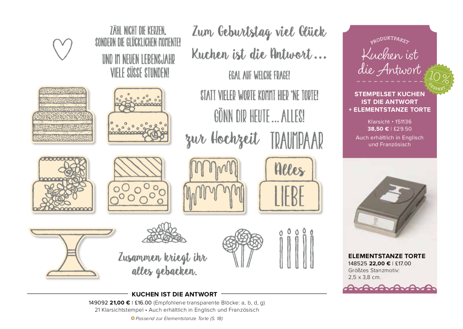 Kuchen ist die Antwort ist ein Produktpaket das aus einem Stempelset und einer Handstanze besteht. Damit kannst du viele verschieden Geburtstagstorten “backen und dekorieren”. Zuerst dachte ich: Na gut, mal wieder ein Stempelset mit Torten. Der nächste Gedanke war: Aber immerhin gibt es eine Handstanze dazu! Handstanzen muss ich immer haben – Sammlereffekt 😉 Und dann noch die witzigen Sprüche? Gekauft!