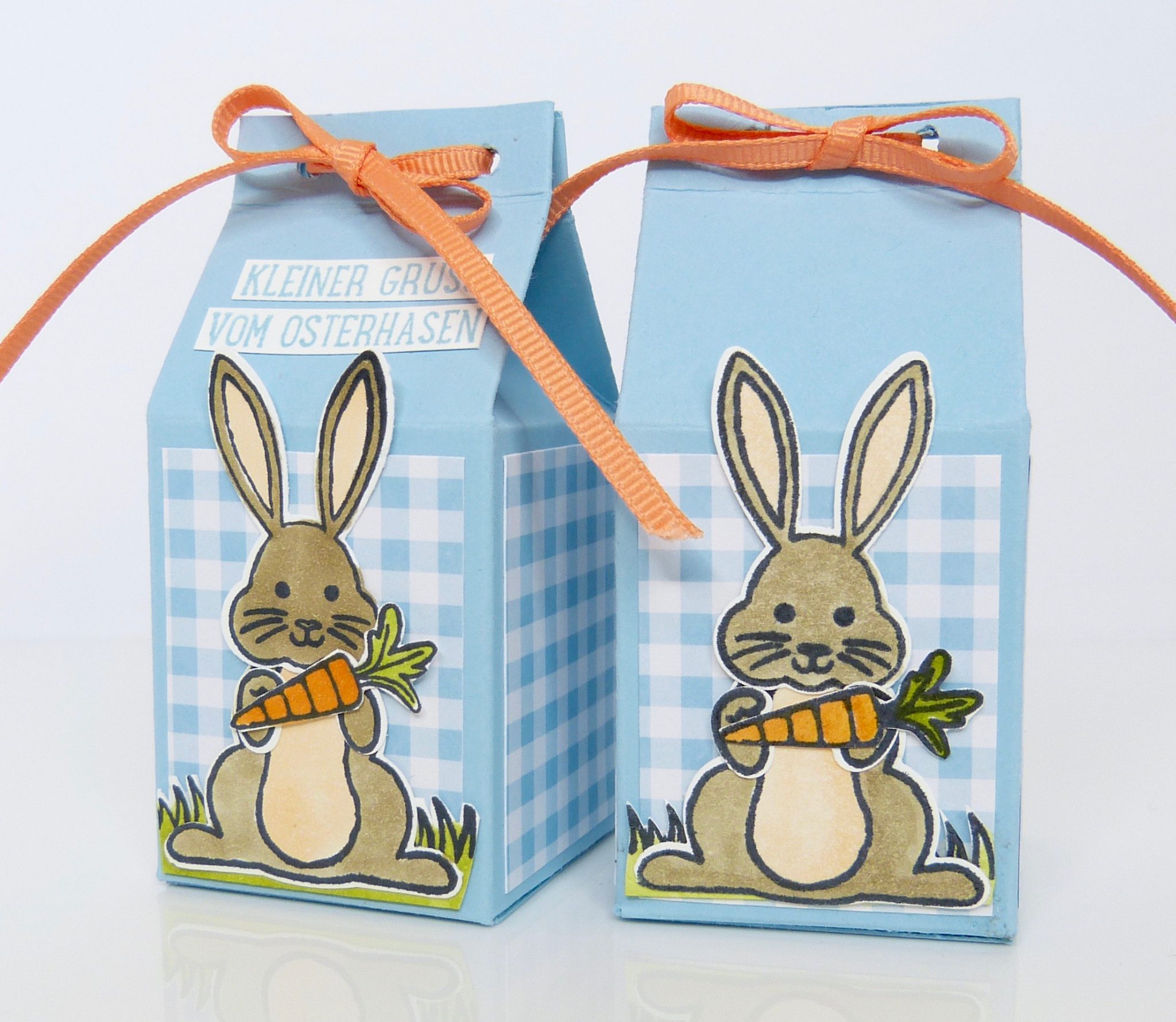 Bist du schon in den Vorbereitungen für Ostern? Damit du noch rechtzeitig ein paar kleine Geschenkverpackungen für den Frühstückstisch oder für die Ostereiersuche basteln kannst, habe ich heute eine Anleitung für einen kleinen Mini Milchkarton mit dem Stempelset Hasengrüße von Stampin’ Up! Dafür gab es mal eine Stanzform für die BigShot und ich habe meine auch noch. Für alle, die sie nicht haben, ist diese Anleitung gedacht. Und es ist auch gar nicht so schwer.