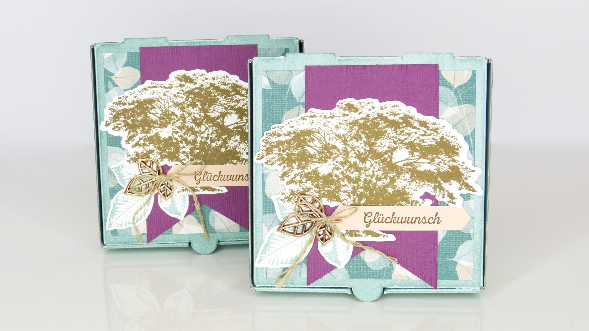 Eingefärbt habe ich die Pizzaboxen wieder mit der Schwammwalzen Technik. Und weil ich mich weder für eine Farbe noch für ein einziges Designerpapier entscheiden konnte, kam es wie es kommen musste und die Schachteln fingen an, sich zu stapeln.