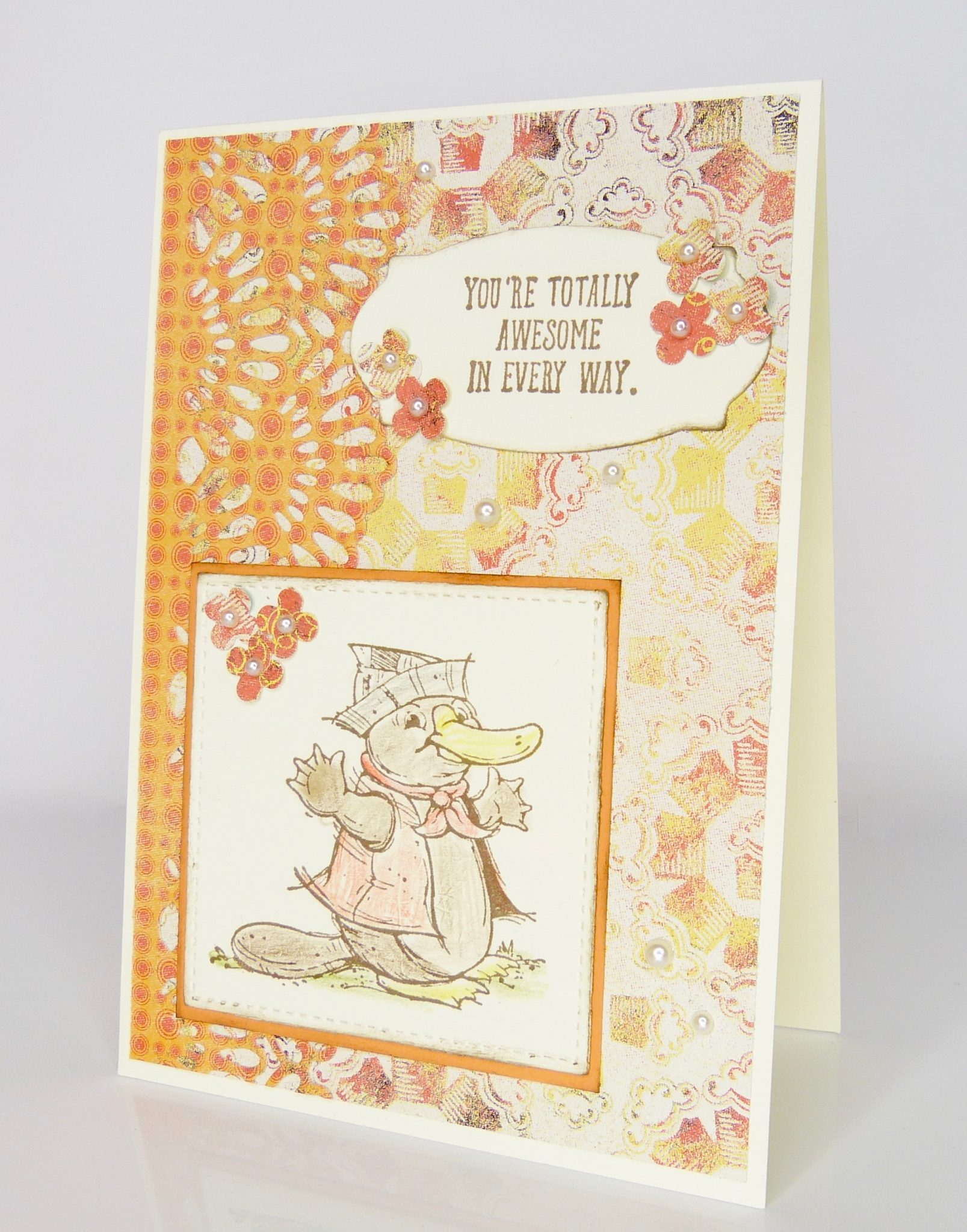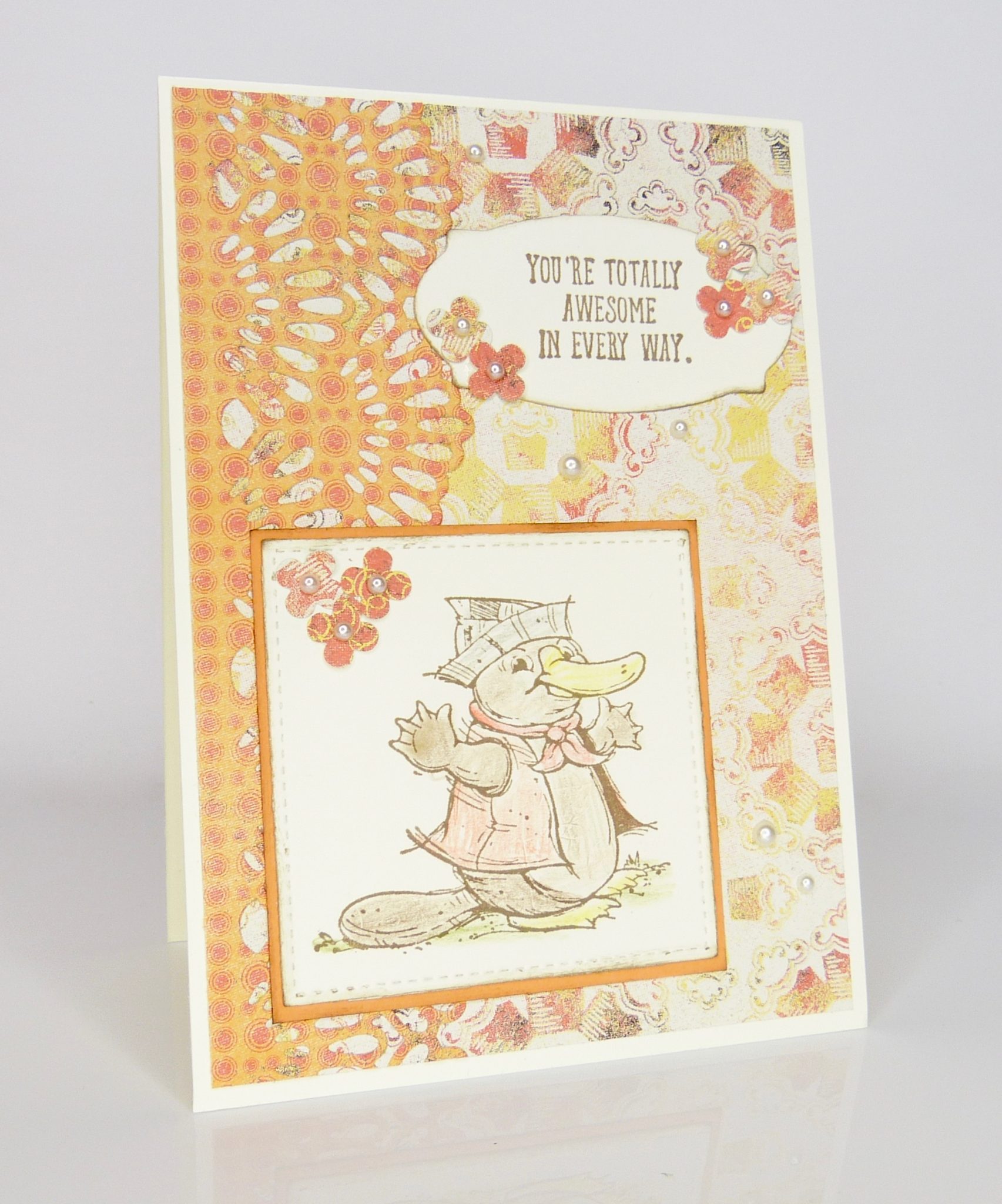 Postcard Pals Karte mit Schnabeltier Warme Orangetöne überwiegen bei dieser Karte. Koloriert habe ich wieder mit den Aquarellstiften von Stampin‘ Up! Die Ränder der Quadrate und des Etiketts sind mit einem Fingerschwämmchen gewischt. Mein kostbarer Schatz, die IttyBitty Stanze, durfte ein paar Blümchen aus Resten des Designerpapiers beisteuern. Die kleine Stanze wird auf diversen Verkaufsplattformen noch immer zu irrsinnigen Preisen gehandelt. Ich würde meine ab 1 Million Euro hergeben, falls jemand Interesse hat 😉