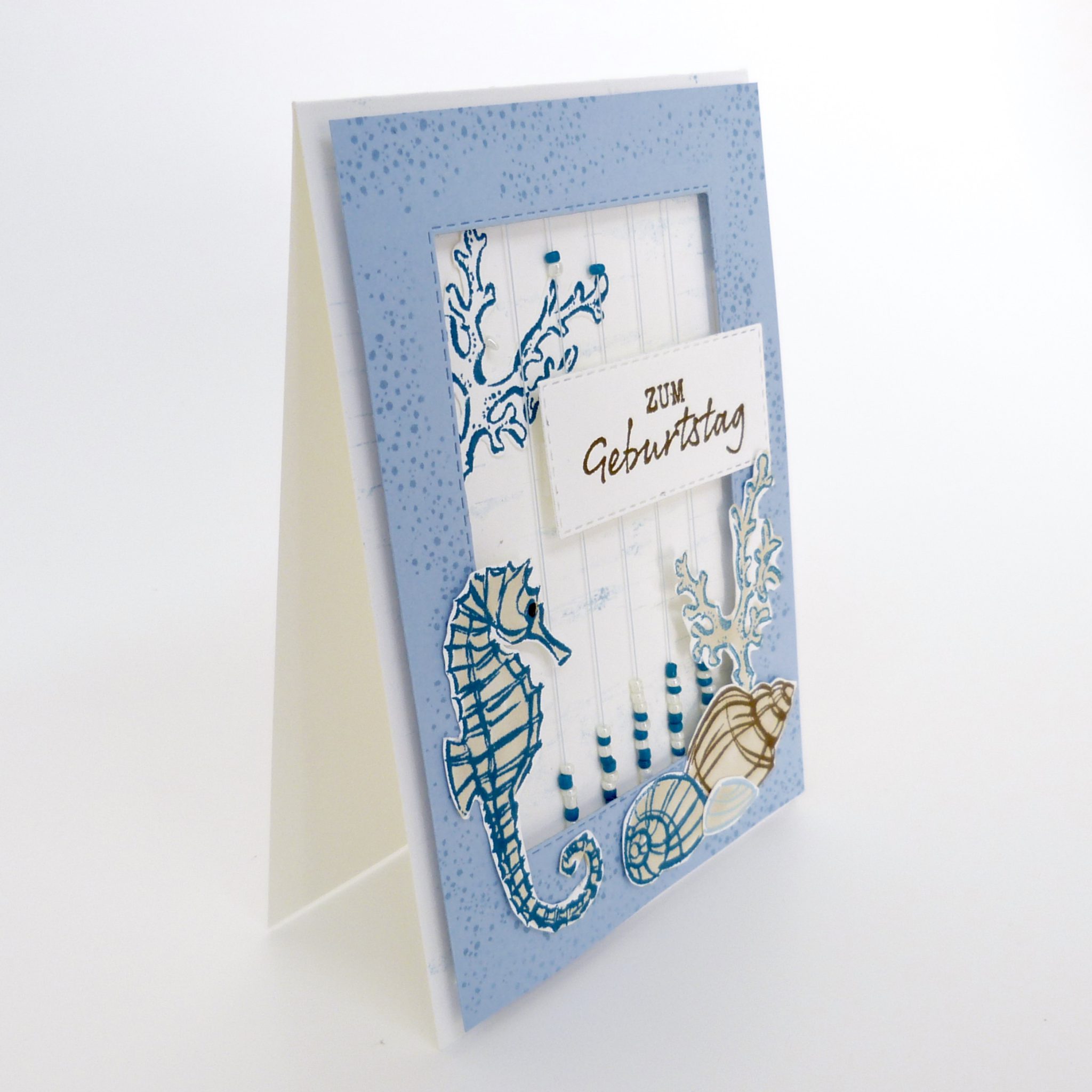 Was ist denn bitte schön eine Regentropfenkarte? Vielleicht ist die Karte draußen nass geregnet worden? Nein, natürlich nicht. Die Regentropfenkarte ist eine sogenannte interaktive Karte, bei der durch das Kippen der Karte sich Perlen wie Regentropfen über die Karte bewegen. Bei der Karte, die ich dir in meinem Videotutorial vorstelle, sind es allerdings keine Regentropfen, denn ich habe eine Unterwasserszene gestempelt. In dem Fall sind es wohl eher Blubberblasen. Unabhängig davon ist es ein ganz toller Effekt, etwas aufwändiger zu basteln aber absolut lohnenswert.