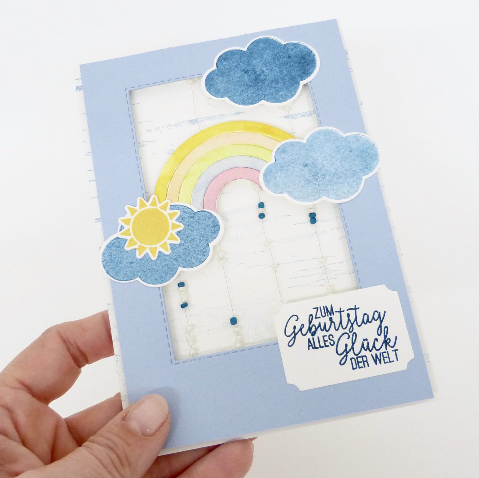 Einige der aufgelisteten Sachen sind aktuell nicht mehr bestellbar, zum Beispiel das Stempelkissen in Petrol oder die Streuelemente Traum vom Meer. Da musst/kannst du sicher Alternativen finden. Wichtig ist für die Umsetzung der Regentropfenkarte die Technik, mit der die Fäden gespannt werden, damit die Perlen auch richtig schön hin- und her rutschen. Aber das erkläre ich dir ja ausführlich in meinem Video.