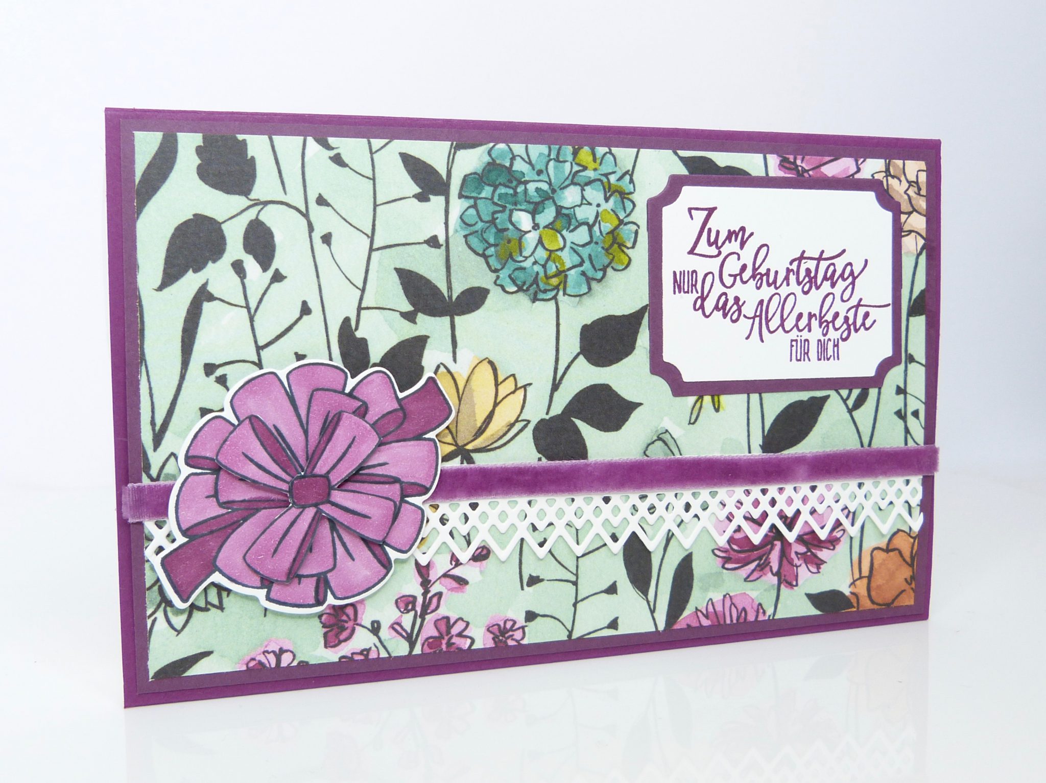 Das Samtband in Himbeerrot (im Katalog steht: Hübsch und edel – ein echter Hingucker) habe ich mit einem Edgelit Feine Spitze unterlegt. Die Länge ist nicht ganz ausreichend für meine Schachtel, deshalb habe ich es hinter der Schleife geteilt 😉