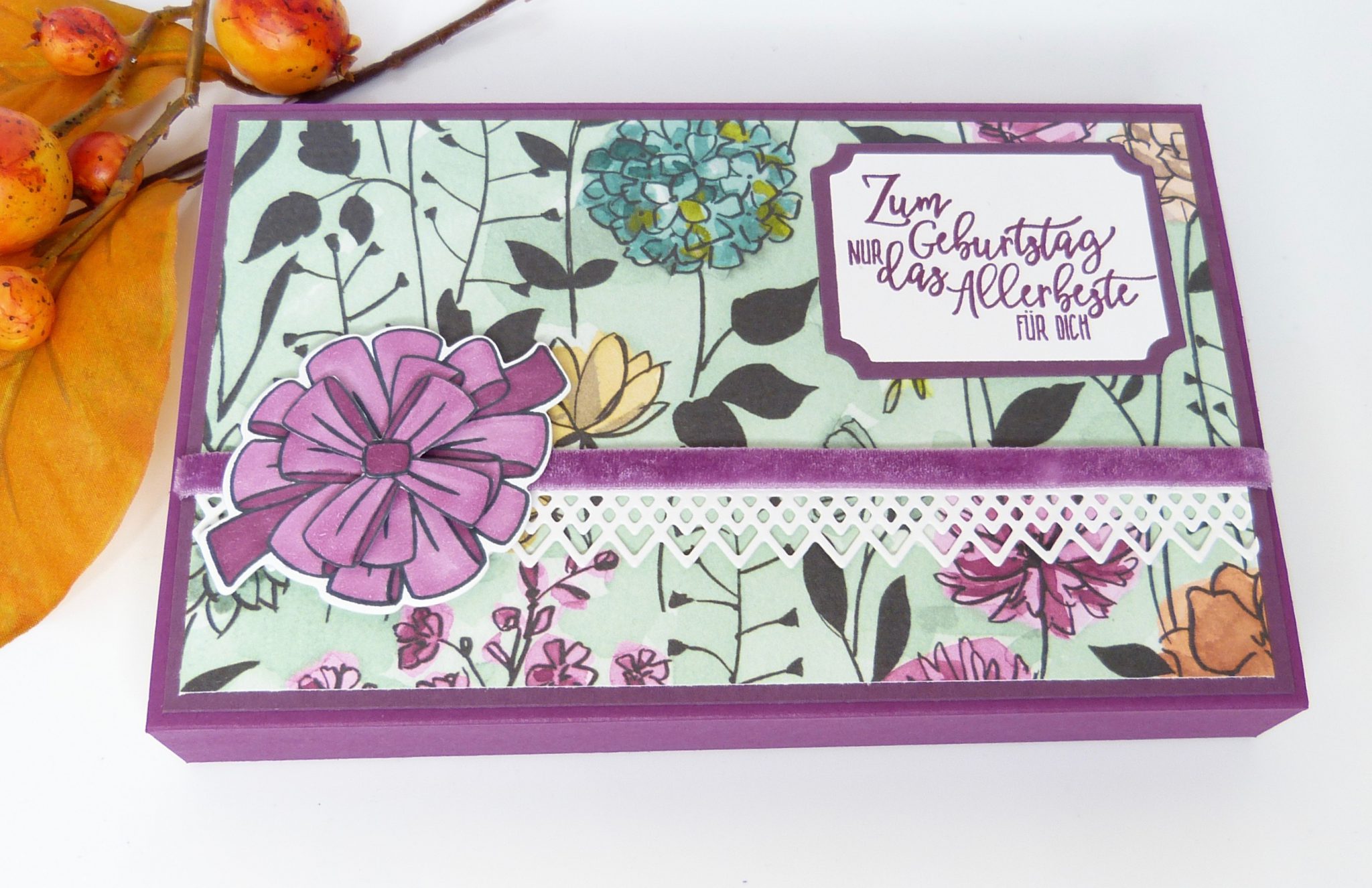 Ich habe ein kleines Geburtstagsgeschenk für unsere Nachbarin gebraucht und da kam mir diese Verpackung in den Sinn. Die Hülle für die Toffis ist in Himbeerrot, der Rahmen in Feige. Das Designerpapier Geteilte Leidenschaft bildet den schönen Hintergrund.