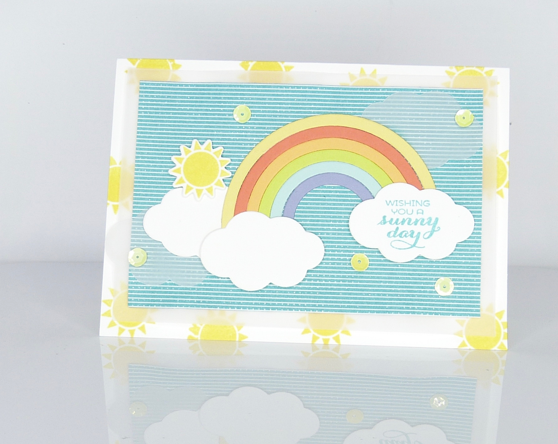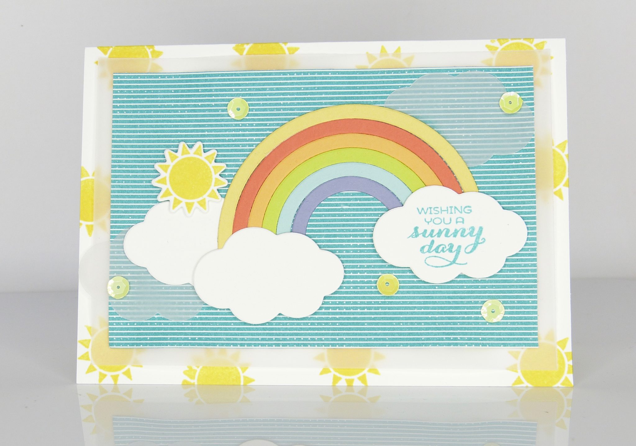 Obwohl ein Regenbogen ja eigentlich nur bei Sonne UND Regen entsteht (ein bisschen Abkühlung wäre bei dem aktuellen Wetter wirklich nicht schlecht), ist diese Karte ein absoluter Sommertraum. Die Farben – der Knaller. Dazu noch ein paar glänzende Pailletten und ein wenig transparentes Papier im Hintergrund und als Wolken und natürlich ganz viel Sonne.