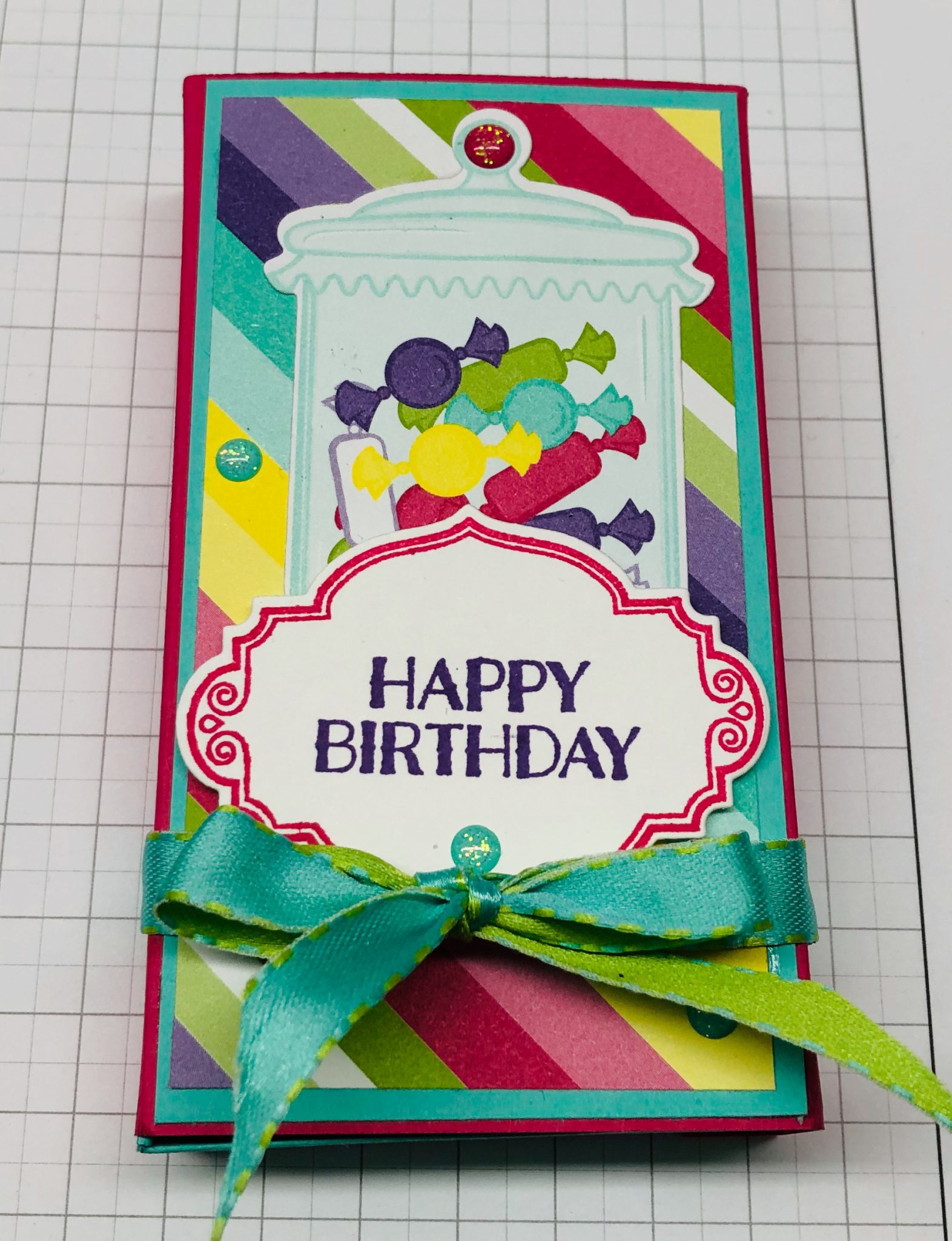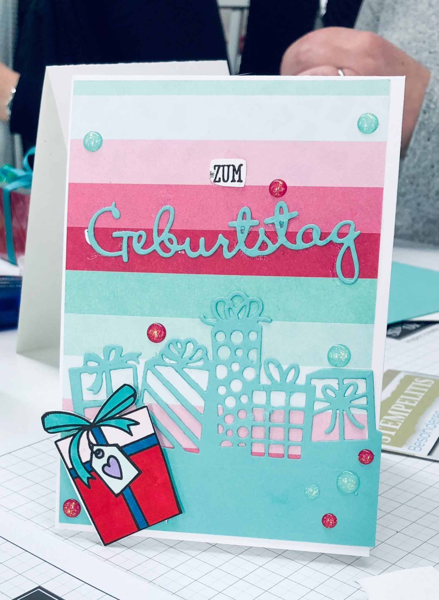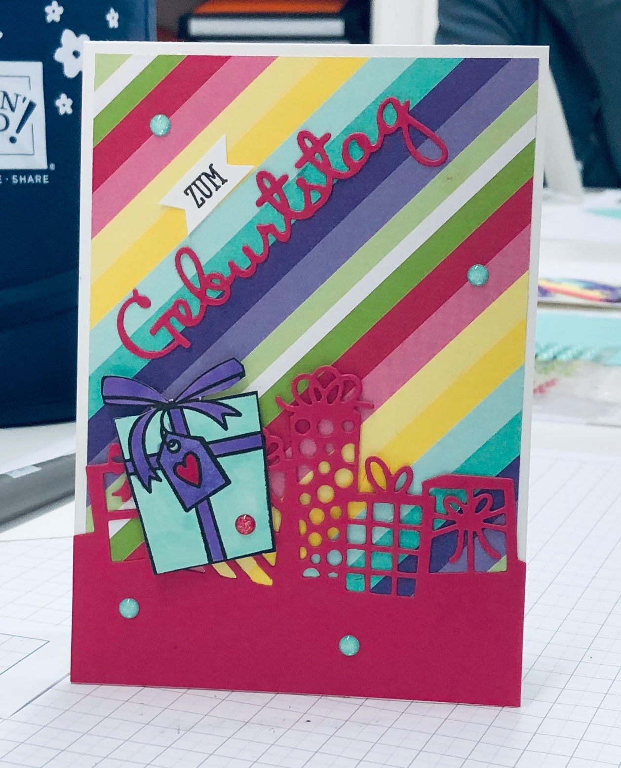 Weil sich kurzfristig noch zwei Bastlerinnen eingefunden haben, mussten wir ein wenig Stühle rücken, aber dann ging es mit viel Freude los. Ich weiß gar nicht, ob ich alles fotografiert habe, aber hier sind ein paar Bilder von den fertigen Werken. Zuerst haben wir die Geburtstagskarte gebastelt. Bei den Farben konnte jede aus meinem vorbereiteten Material auswählen. Das Designerpapier Süsse Überraschung ist aus dem noch bis 3. Juni gültigen Frühjahrskatalog.