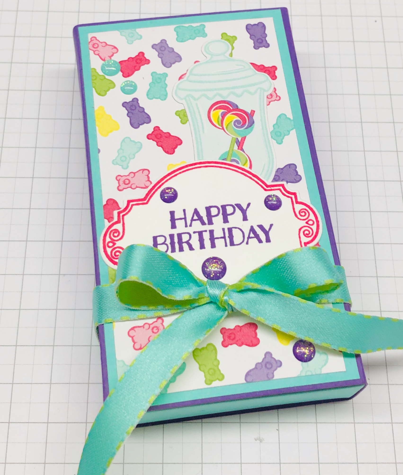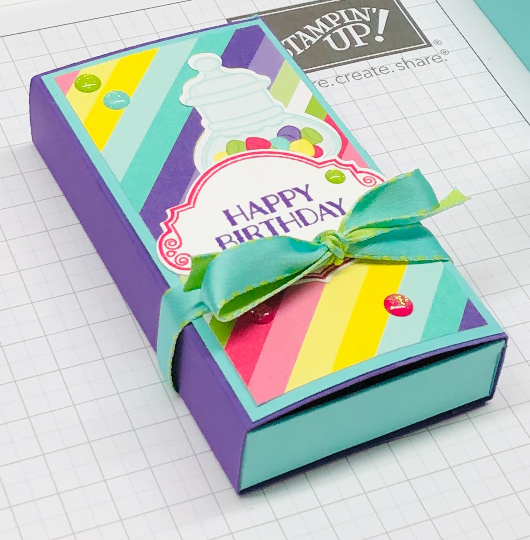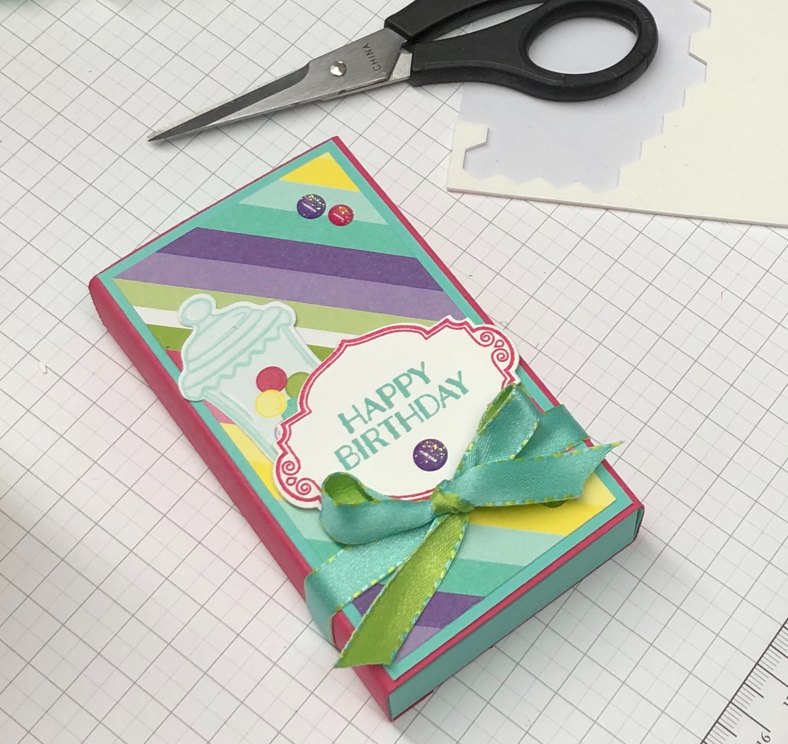 Nachdem sich alle mit dieser Karte warmgebastelt hatten, ging es weiter mit der Pop-Up Box. Auch hier konnte sich jeder seine Farben und sein Designerpapier aus den vorbereiteten Zuschnitten aussuchen. Die Schoki, die in die Box sollte, lag schon die ganze Zeit auf dem Tisch. Und alles, was nicht verpackt wurde, konnte anschließend noch direkt vernascht werden 😉 Oder andersrum: Alles, was noch nicht vernascht war, konnte in die Box gefüllt werden.